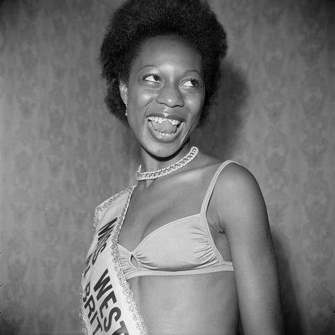 They are united by white stilettos and white skin, both of which details matter. In the long history of Miss GB, there have only ever been two women of colour given the crown: the grimly ubiquitous whiteness of the competition continues, quietly perpetuating harm with a bright smiling face. Raphael Albert’s portraits of Black and Beautiful contests provide breaths of something different, not only for the inclusion of Black bodies but for the change in tone these images bring, often defined more by joy and solidarity than stiffened grins. Glimmers from more local competitions complicate these questions, too – in 1975, Beverley Heath-Hoyland was a runner up in the Miss Margate competition, photographed below. She went on to dominate West Indian beauty contests in Britain, and to forge a career as a successful buisnesswoman, too. Though this changes nothing about the structural violences threaded into these spectacles, it does remind us that illusory all-white line-ups were being inevitably and quietly challenged by women of colour in towns up and down the country.