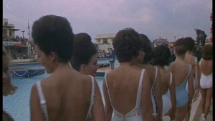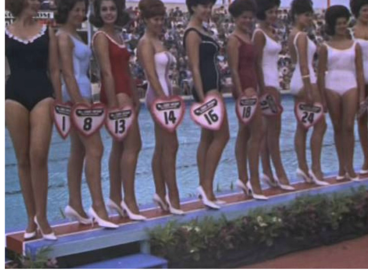 In a clip I found online, the camera pans over these women, who are facing away. Seeing only their shoulders, the effect is, momentarily, a little sinister. We’re chasing these women, hounding them. In the archive, rifling through for some grasp of the “real,” I know I have been chasing them, too. The women smile, clutching numbered hearts whilst grey men frown at clipboards. We are far too close to the women’s legs. Then, a perfect crown. One of the grey men tries to kiss the winner. Stiff. A brief moment of reprieve, as into the Summer Swimming Stadium, the grey men seem to tumble. The women are still standing tall.