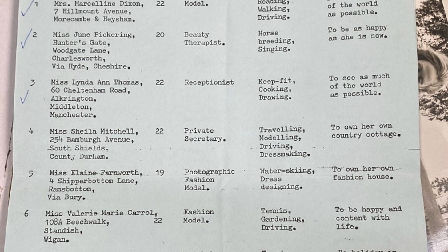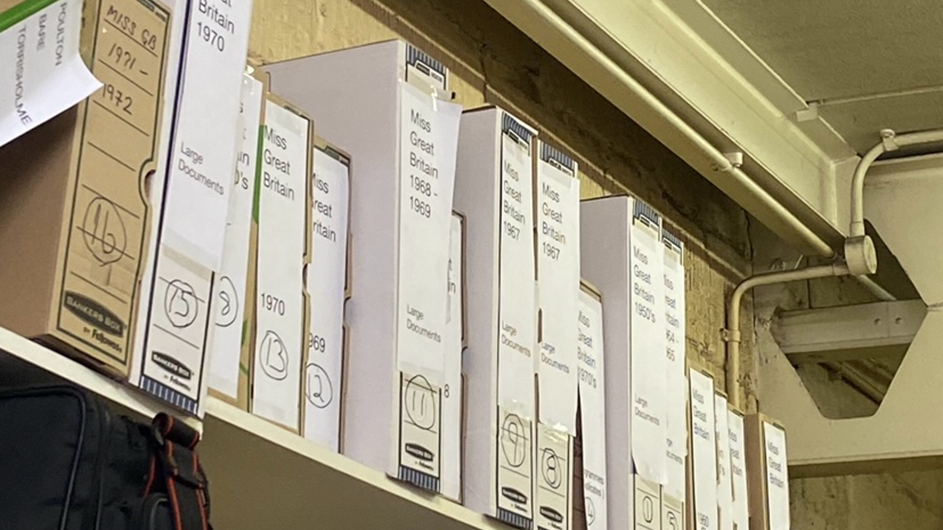 In the constraints of the latter column, these women’s feelings are neatly typed out and filed away, unlikely to be dusted off often. I teeter on my stepladder, trying to find deepest dreams and complex inner lives in the backroom of a municipal shopping centre. At 4PM, the shops will close, and I will have to leave. The women will be packed away. I have the urge to take something with me, and find that in the visitor centre downstairs, I can buy a postcard, a slice of these women to greedily slip into my bag. I place the postcard on my mantlepiece, and now several women competing at the 1963 Miss Great Britain contest grin down at me as I watch TV from my sofa, shaming me into sitting up just a little straighter.