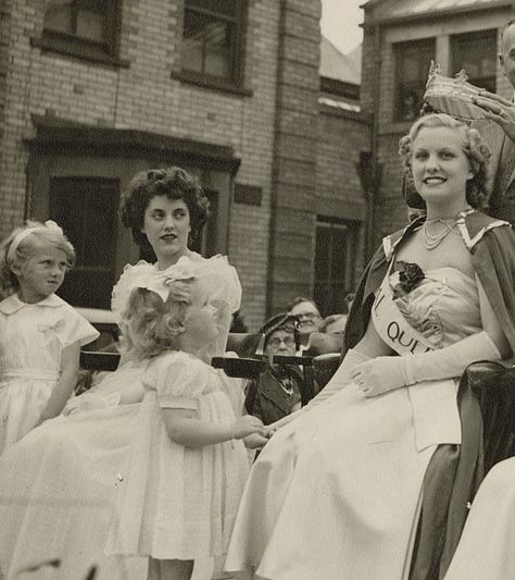 For years and years, the Queens of Industry reigned symbolically over Britain’s labouring class. Women were chosen through pageant style contests to represent trades that they, or their families worked in. Once selected, they often travelled the world, giving speeches, meeting politicians, and being seen to be seen. Bonkers pomp and genuine civic responsibility, blurred.