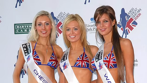 And glamour is an intensely creative practice, which renders the Miss GB contestants not just victims, but active practitioners, too. In one interview I found whilst researching seaside glamour contests, a woman recalled her entry in the early 1970s, wearing a party dress made of net curtains. Textile Queen, DIY style. The work of a great many sociologists and historians can help us to see this kind of body work as a fundamentally creative one, which isn’t to negate the function played by capitalism, nor the restrictions that still surround working-class women’s lives, nor the violent systems that these women were often helping to perpetuate, but is simply to reinsert creativity back into the story, to let ourselves think capaciously about them, to let ourselves be wowed by the glamours they cast, and then turn our eye to ask how and why they do it, in what circumstances, and to what ends.